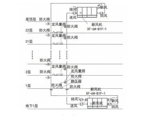新風(fēng)系統(tǒng)采用分段式送風(fēng)方式,氣流組織為下送上排,新風(fēng)機(jī)組設(shè)置于地下1層和屋頂層的新風(fēng)機(jī)房。室外新風(fēng)經(jīng)新風(fēng)機(jī)組冷卻、除濕處理后,輸送到新風(fēng)豎井;室內(nèi)新風(fēng)支管從新風(fēng)豎井處接出,經(jīng)防火閥和定風(fēng)量閥后,流經(jīng)集管,再向室內(nèi)各個房間輸送,其中廚房和衛(wèi)生間僅設(shè)置排風(fēng)。房間的排風(fēng)口設(shè)置于上部,通過起居室的集中排風(fēng)口排至排風(fēng)豎井,再經(jīng)換熱后排至室外。